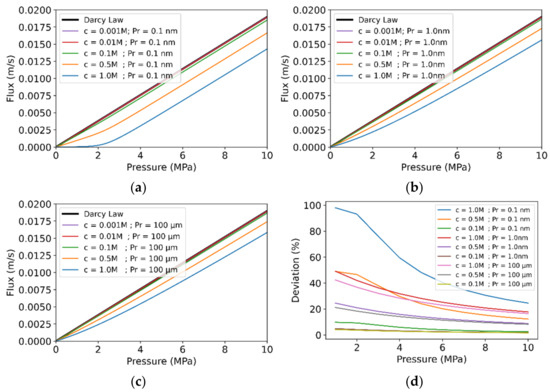 Furthermore, the model was simulated at different bulk solvent concentrations while keeping the other parameters constant to determine the effect of the bulk fluid concentration on the possible deviation from the Darcy law. The range of simulated concentrations is between . The results for pore radii of 0.1 nm, 1 nm, and 100 μm are presented in Figure 6a–c, respectively. The results show that the deviation from the Darcy law increases with the increasing bulk solute concentration (Figure 6d). In addition, there is a pressure threshold (limiting pressure ), above which there is linearity between the resultant flux and the pressure difference and below which there is non-linearity. The results presented in Figure 6d show that the bulk concentration is the dominant parameter that affects the resultant flux below the limiting pressure. In contrast, the pore radius is the dominant parameter that controls the deviation from the Darcy law above the limiting pressure.