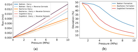 This simple pore-scale model simulation has given insight into the extent of deviation from the Darcy law due to reverse osmosis. The range of 8% to 49% deviation from the Darcy law in a simple geometry is high enough to present an inaccurate estimation in reservoir models where the conditions for reverse osmosis are met, and the Darcy law is applied. The simulated parameters from the shale and tight reservoirs show that the limiting pressure for the various formations is 4 MPa, 1.6 MPa, and 2.6 MPa for the Bakken, Bazhenov, and Eagle Ford formations, respectively. In effect, below the limiting pressure, there is a non-linear proportionality between the resultant flux and the pressure difference. Estimating the resultant flux below the limiting pressure without considering the non-linear term between the fluid flux and the pressure difference will lead to over-predicting the resultant flux. Similarly, above the limiting pressure, where a linear proportionality between the fluid flux and the pressure drop is established, the Darcy equation still overestimates the fluid flux, as shown in Figure 7a. In the absence of a chemical potential gradient in the pore network, the extra term on the right-hand side of Equation (14) reduces to zero, and the equation becomes the classical Darcy law.