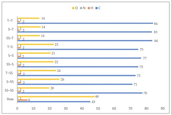 The elemental are reported in Figure 1, where aromaticity and polarity may be determined. All samples had similar aromaticity denoted by closed H/C ratios, while S–SS have the greatest polarity. Due to the highest O/C, S–SS subsequently demonstrated the highest iodine adsorption. The O2 presence accelerated pyrolysis, as well as increased aromatic rings and porosity []. Furthermore, the superheated activation produced satisfactory oxygen functionality based on the increased O–elements.