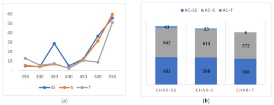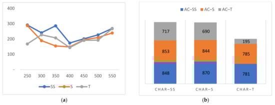 In the fourth stage, active thermal decomposition occurred from Tig to final combustion temperature (Tbo) was assumed as extinguish point. The fastest and slowest decomposition phases originated from SS–SS and SS–T, respectively. The result clearly denotes some hypotheses: (1) samples were highly reactive to superheating in carbonization, and (2) thermal activation was inert against ash and volatile content, even at 800 °C. Thermal workings through the release of hydrocarbon bonds and interfering substances []. In addition, the first assumption was essentially in line with the previous study, through superheated treatment in the torrefaction process []. At 300–400 °C, almost all pyrolysis samples were oxidized as expressed by the onset point value. A summary and illustration of the DTG–DSC data are presented in Figure S2.