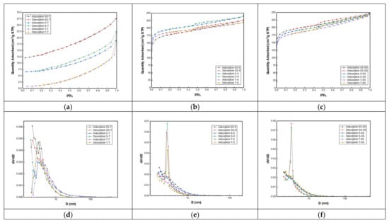 Nitrogen adsorption–desorption isotherm and pore size distribution of prepared activated carbon. (a,d) thermal activation; (b,e) saturated steam activation; (c,f) superheated steam activation.