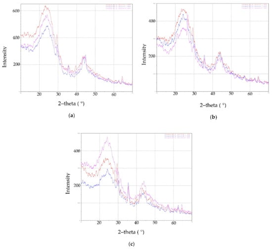 X-ray diffractogram of the prepared activated carbon: (a) thermal activation (red line T–T, blue line S–T, purple line SS–T); (b) steam activation (red line T–S, purple line S–S, blue line SS–S); (c) superheated activation (red line T–SS, blue line S–SS, purple line SS–SS).