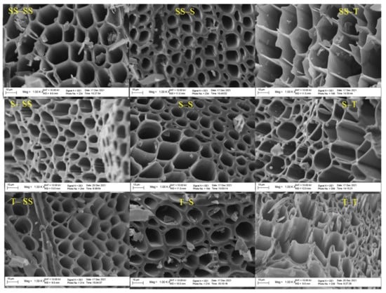 The SEM image is shown in Figure 6. Activated carbon prepared by saturation and superheating has better pore development than thermal alone. Pyrochar assisted by superheating showed a wide pore diameter. However, the creation of small–holes by steam activation adorns the product surface for an increase in the BET surface area, as in the SS–S sample. Saturated–assisted biochar showed a reduced pore diameter compared to superheated–assisted pyrochar. However, superheated activation results in the widening of the pores to provide an active site for iodine adsorption as indicated in the S–SS sample. Activated carbon S–SS had the highest iodine adsorption, as demonstrated in Figure 4. Pyrochar derived from thermal treatment showed a more irregular structure and showed a footprint of the release of non–C fraction, particularly shown by sample T–T. In general, steam-assisted activation (saturation and superheated) showed more satisfactory creation and pore development than thermal treatment alone.