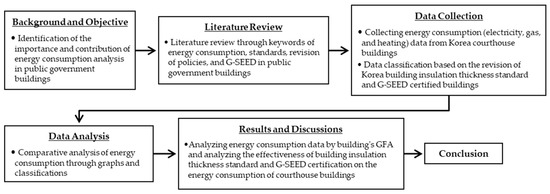 This study was conducted to analyze and examine the effectiveness of the revision of the building insulation thickness standard and G-SEED certification on the energy consumption of public government courthouse buildings. The steps followed in this study are shown in Figure 1. Prior to the data collection, previous literature was first reviewed to obtain the effect of G-SEED certification and the revision of the building insulation thickness standard on the energy consumption of public buildings, after which the review was summarized and used as a basis for the analysis of this study.