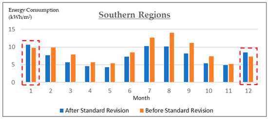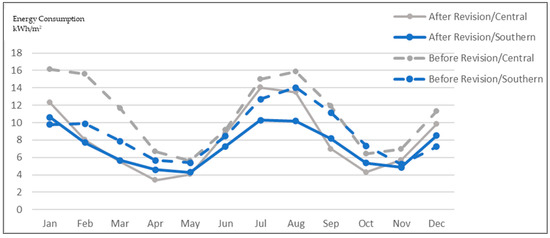 The blue lines (both dotted and solid lines) in the image represent the buildings in the southern area, which reflects the positive impact of the revision of building insulation thickness standard on the energy consumption of courthouse buildings in this area. However, compared with the increase in the energy consumption efficiency of the courthouse buildings during winter, the efficiency in January and December decreased. As shown in Figure 4, in the winter season, courthouse buildings that implemented the revised insulation thickness standard consumed 8.51 and 10.62 kWh/m2 of energy in December and January, respectively, whereas buildings where the standard was not applied consumed 7.23 and 9.78 kWh/m2 of energy, respectively. These results indicated that the revision of the building insulation thickness standard was not very effective for buildings in the southern area, particularly in the winter season from December to January.