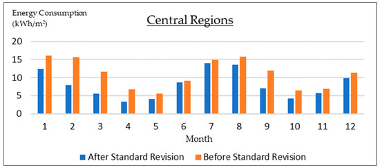 The revision of the insulation thickness standard contains the increase in insulation thickness building envelopes. The results revealed that increasing the insulation thickness contributed to the energy consumption efficiency of the Korean courthouses buildings, as shown in the comparison graph in Figure 2. The dotted lines in Figure 2 represent the energy consumption of the buildings constructed prior to the revision of the building insulation thickness standard, and the solid lines represent the energy consumption of buildings constructed after the revision. The gray lines (both dotted and solid lines), which represent the buildings in the central area, revealed that the increase in the building insulation thickness significantly contributed to the energy efficiency of the buildings (particularly at the beginning of the year from January to April), although the provided efficiency was high during the summer season. Figure 3 shows the bar chart of the comparison of the energy consumption of the courthouse buildings in the central regions. Generally, as shown in Figure 3, the increase in the building insulation thickness effectively enhanced the energy consumption of courthouse buildings.