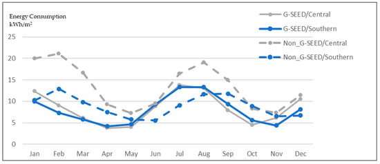 G-SEED certified buildings exhibited effective energy consumption compared with the non-certified buildings. Figure 5 illustrates the positive effects of the G-SEED certification for reducing the energy consumption of buildings in the central area (the gray lines). However, in the summer season, the energy consumptions of the G-SEED certified buildings in the southern area (the blue lines) were higher than those of non-certified buildings. These findings indicated that the G-SEED assessment process in the southern area did not consider the energy consumption during the summer season.