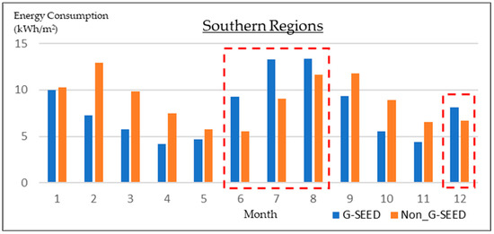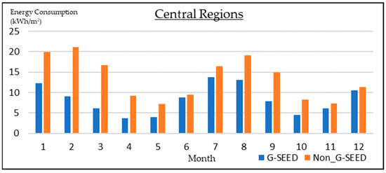 Figure 6 and Figure 7 show bar charts showing the comparison between the energy consumption of G-SEED certified (blue) and G-SEED non-certified (orange) buildings. In the central region (Figure 6), the monthly energy consumption of the G-SEED certified buildings was satisfactory. As shown in Figure 7, the energy consumptions of the G-SEED non-certified buildings in the southern areas from June to August were 5.56, 9.06, and 11.63 kWh/m2, respectively, and 6.68 kWh/m2 in December. However, those of the G-SEED certified buildings from June to August were 9.29, 13.29, and 13.33 kWh/m2, consecutively, and 8.15 kWh/m2 in December. These results indicated the ineffective energy consumption of the G-SEED certified buildings in the Southern area from June to August and in December.