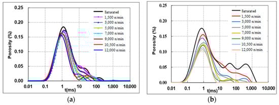 NMR T2 spectrum curves at different rotational speeds: (a) before fracture; (b) after fracture.