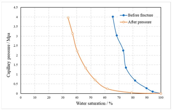 The graph of the displacement pressure before fracture is shown in Figure 2 and indicates that when the displacement pressure increases to 0.7 MPa, only less than 20% of the water is displaced by the gas. Because this part of water exists in the large pores of the core, it can be displaced with only a small pressure. When the displacement pressure increased from 0.7 to 3 MPa, the gas flow rate increased because the displacement pressure overcomes part of the capillary force and drives part of the water flow in the pore space, eventually displacing about 10% of the water. When the displacement pressure increased to 4 MPa, the presence of a dense core and small porosity made the seepage channel resistance higher, so the water saturation of the core was around 70%, and still, more than two-thirds of the water was not displaced. This indicates that the gas flooding effect is still poor, and the water-blocking effect occurs in the reservoir, which leads to a significant reduction in gas production and ultimately affects the production of gas wells.