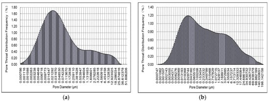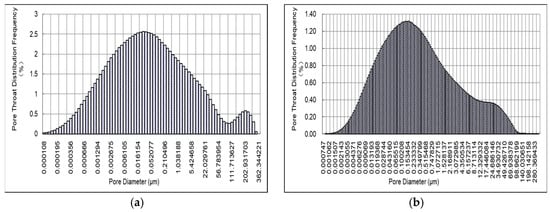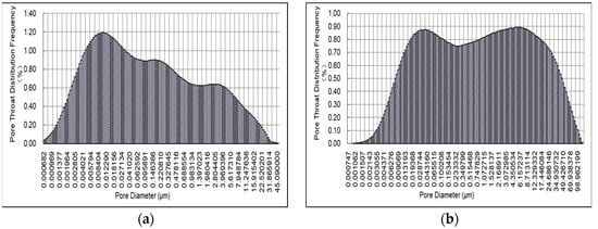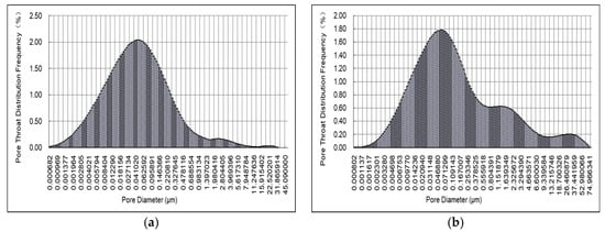 Distribution of core pore size (No. 51 of Well XX2-1-5): (a) before fracture; (b) after fracture.