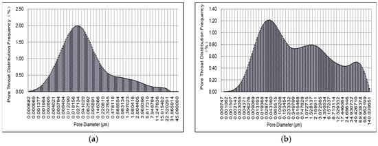 Distribution of core pore size (No. 19 of Well XX1003): (a) before fracture; (b) After fracture.