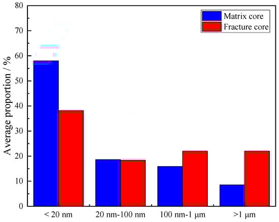 Comparing the average values of pore size distribution before and after fracture (Figure 8), it is found that the center of the core pore size distribution has shifted towards large sizes. From the overall view of the five samples, it is found that the ratio of pore throat of less than 20 nm decreased by 19.82%, the ratio of 20 nm–100 nm decreased by 0.25%, the ratio of 100 nm–1 μm increased by 6.63%, and the ratio of greater than 1 μm increased by 13.44% after the fracture. Fractures widen the pore size distribution, thereby improving fluid flow channels and converting bound water in small pores into moveable water. By reducing the capillary resistance, the bound water in the small pore space is displaced out, making the residual water saturation reduced and mitigating the water-blocking effect.