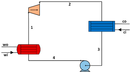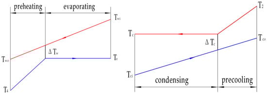 The evaporator adopted in this study is a flooded evaporator, and the working fluid is in a saturated vapor state at the evaporator outlet. The condenser is a shell and tube heat exchanger, and the working fluid condenses to a saturated liquid state on the shell side of the condenser. The phase-change process is divided into two parts for both the evaporator and the condenser, as shown in Figure 2.