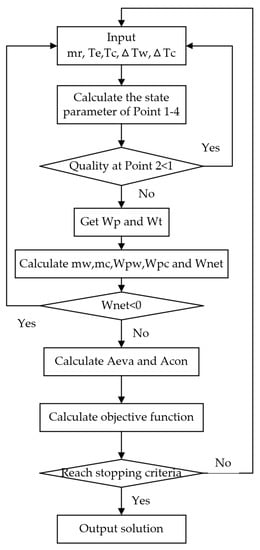 In this study, we wrote a Matlab calculation program based on the above mathematical model; the calculation flowchart of the Matlab program is shown in Figure 3. The multi-objective optimization was performed by the gamultiobj solver (multi-objective optimization using Genetic Algorithm, which is a variant of NSGA-II [31]) in the optimization toolbox of Matlab. In the calculation process, the population of the genetic algorithm is constrained and screened by constraining the quality of the working fluid at the turbine outlet and the positive and negative of the net output power of the entire OTEC system.