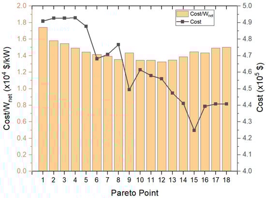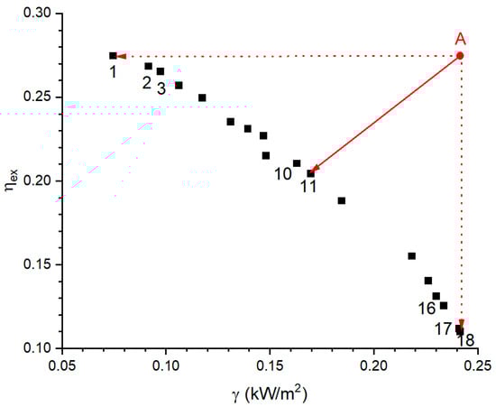 The optimization goals of this study were to maximize the net output power per unit area and the exergy efficiency. This study obtained 18 Pareto frontier points through multi-objective optimization using a genetic algorithm. The following conclusions are drawn: