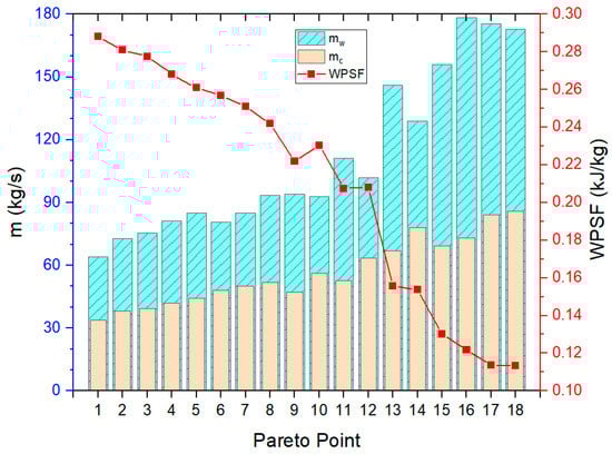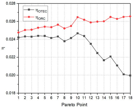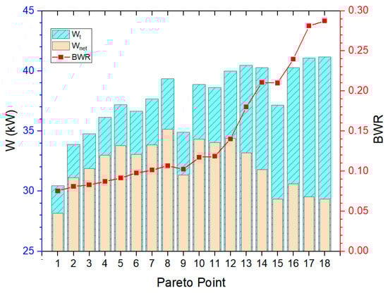 The results of multi-objective optimization are a set of non-inferior solutions. In addition to the objective functions, there are many meaningful performance parameters of the OTEC system which can be used to evaluate these non-inferior solutions. These meaningful performance parameters include the thermal efficiencies of the OTEC () and ORC (), the back work ratio (BWR), the net output power (), the net output power per unit of seawater flow (), the cold seawater flow (), and the investment cost (Cost), etc.