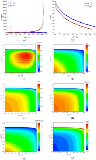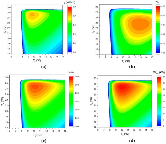 From Figure 10c–h, it can be seen that the effects of and on the net output power per unit area (γ) are different from those of the other terms. This is because only the net output power per unit area is related to both seawater flow rate and heat transfer area. The other terms are only related to seawater flow rate. This results in all of the performance parameters except the net output power per unit area decreasing as the pinch-point temperature difference increases.