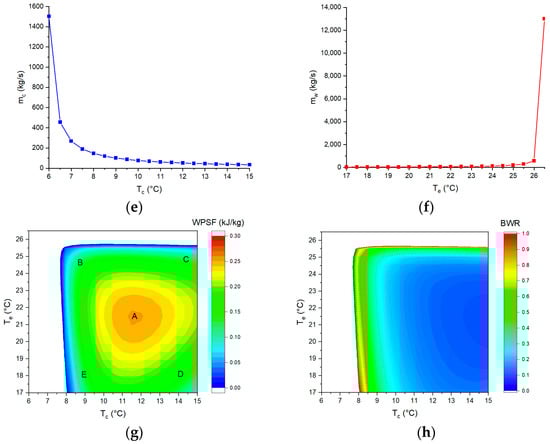 Figure 9g shows the effects of evaporating temperature and condensing temperature on the net output power per unit seawater flow rate (WPSF). The WPSF value in the A region is larger because the seawater flow rate is lower. The lower WPSF values in the C and E regions are mainly due to the higher seawater flow rate. Although the net output power in the B region is higher, the high seawater flow rate leads to a smaller WPSF value. The reason for the smaller WPSF value in the D region is opposite to that for the value in the B region. The seawater flow rate in the D region is small, but the net output power is also small, resulting in a small WPSF value.
