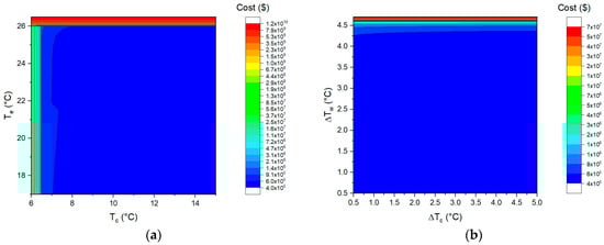 As can be seen from Figure 11a, the smaller the difference between the evaporating temperature and the surface seawater temperature, the greater the equipment investment cost. The same holds for the condensing temperature and deep seawater temperature. Therefore, to reduce equipment costs, it should be optimized away from the seawater temperature. In addition, when optimizing the pinch-point temperature difference, the focus should be on the pinch-point temperature difference of the evaporator.