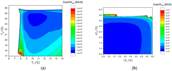 Comparing Figure 12a and Figure 9a, it can be seen that the effects of the evaporating temperature and condensing temperature on the net output power per unit heat exchange area are roughly similar to the effects of the investment cost per unit net output power. Figure 12b shows that the investment cost per unit net output power decreases with decreasing pinch-point temperature difference. The trend in Figure 12b is roughly similar to that in Figure 10f (the effect of the pinch-point temperature difference on the net output power) and not similar to that in Figure 10a (the net output power per unit heat exchange area), mainly because the investment cost is not very sensitive to the pinch-point temperature difference over a large range (as shown in Figure 11b).