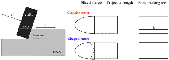 In the process of rock breaking with a special-shaped cutter, due to the change in the shape of the cutter surface, the rock breaking area will be different compared with the circular cutter, as shown in Figure 2. When the rock breaking distance (L) is the same, the larger the rock volume (V) broken by the special-shaped cutter with higher rock breaking area AC, the faster the rock breaking speed. The circular cutter breaking area (A0) is the reference value, creating a dimensionless quantity characterizing the shape change (α):