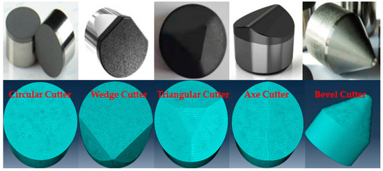 In order to accurately simulate the rock breaking process of the PDC cutters, modeling software was used to establish models of the commonly used special-shaped cutter structures (circular cutter, axe cutter, bevel cutter, wedge cutter, and triangular cutter), as shown in Figure 3, the diameter of the cutters was 16 mm. In the following, we report the main geometrical parameters we tested:
