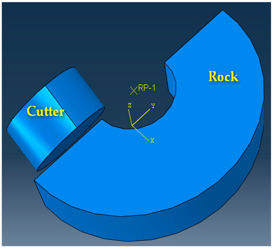 For the convenience of numerical calculation, the cutter was set as a rigid body, the damage of the cutter during drilling was ignored, and the rock element was deleted immediately after it failed. The cutter is shown on the left in Figure 4. The cutting angle of the cutter was 15°, and the side turning angle was 0°. The stratigraphic model was a semi-arc shape with an inner radius of 10 mm and an outer radius of 30 mm, and of 10 mm thickness (as shown in Figure 4).