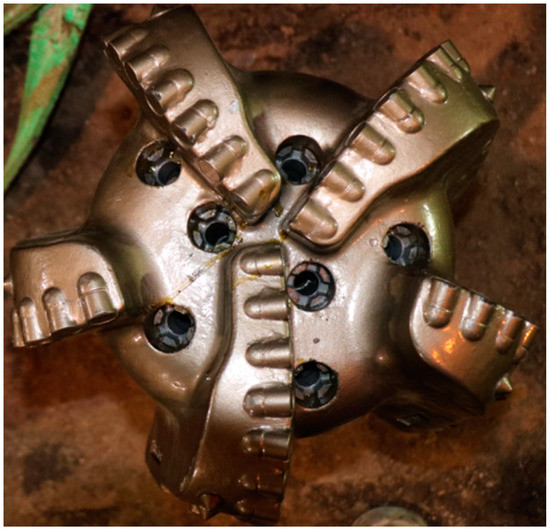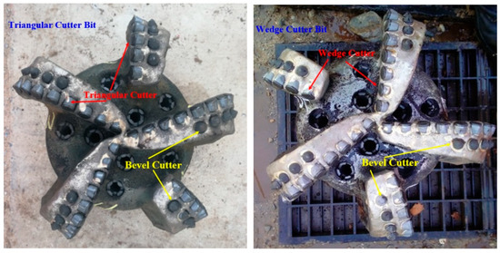 In order to prove the accuracy of the research results, a field experiment was designed and carried out using the bevel cutter as the rear cutter, with either the triangular cutter or the wedge cutter as the front cutter. The experiment was conducted in the ultradeep layer of high temperature and high pressure, at a depth of 6600 m to 7200 m. The formation was interbedded with limestone and mudstone, but under the action of the high confining pressure, the compressive strength (CCS) of the rock formation was very high. Figure 9 shows the PDC bit used in the experiment.