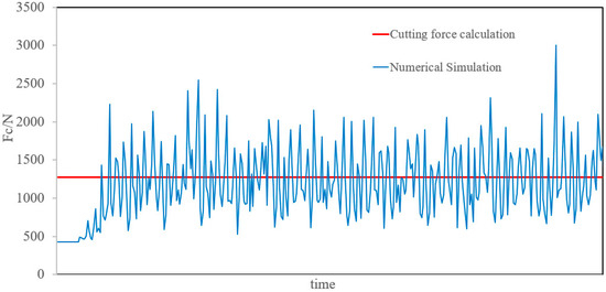 As shown in Figure 5, the number of cutters (n) on the cutting surface of the drill bit is 24. According to Equation (9), the average cutting force (Fc*) of the cutter on the PDC bit was calculated as 1273.95 N. The numerical simulation model was used to conduct a simulation study under the same drilling parameters, and was compared with the calculation results (as shown in Figure 6). Taking the average of the numerical simulation results, Fc was 1225 N. Comparing numerical simulation results and calculation results, the error was only 4%, indicating that the numerical model is relatively accurate, and can be used for cutting simulation research.