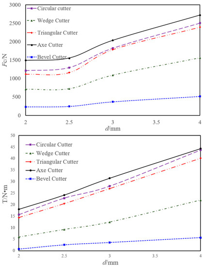 Through numerical simulation analysis, the variation law of the cutting force (Fc) and torque (T) of the five kinds of cutting teeth with the penetration depth (d) was obtained (as shown in Figure 7). With the increase in the depth of penetration, the Fc and T required by the cutter both showed an upward trend. This is because with the increase in the cutting area (Ac), under the condition of a constant rotation rate, the rock breaking volume per unit time increased, and the cutting force required for breaking the rock increased, hence more energy was required. With the increase in d, the changes in Fc and T become more and more severe. This is because with the increase in weight on bit (WOB), the cutter gradually penetrated the formation; at the same time, with the increase in d, Ac increased faster and faster. More Fc and T were required to let the cutter to break the rock.