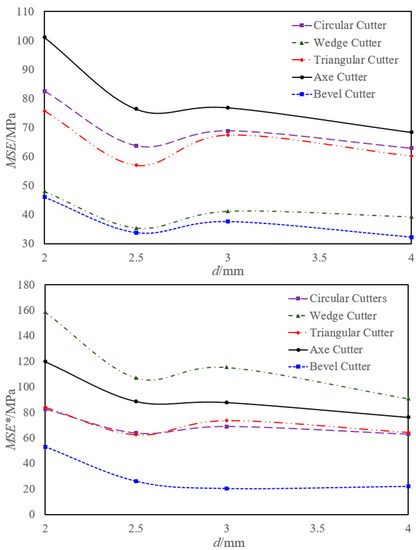 Through numerical simulation analysis, the variation law of the rock breaking specific energy (MSE) and rock breaking efficiency (MSE*) of five kinds of cutters with the penetration depth (d) was obtained (as shown in Figure 8). If d was too large or too small, the rock breaking specific work was larger, and there was a minimum rock breaking specific work value corresponding to the d in the middle. At the beginning, the MSE and MSE* were both large, which was caused by the shallow d and the small Ac. With the increase in d, values of Fc and Ac gradually increased. Since Fc increased slowly when d was shallow, the MSE and MSE* decreased first and then increased. This shows that the PDC cutter had an optimal WOB value, which corresponded to the optimal d of the cutter. Under this WOB, the cutter had a high rock breaking efficiency, low wear, and long service life. Therefore, an appropriate WOB should be selected during drilling to obtain a suitable penetration depth and a small rock breaking torque, to improve the service life of the cutter.