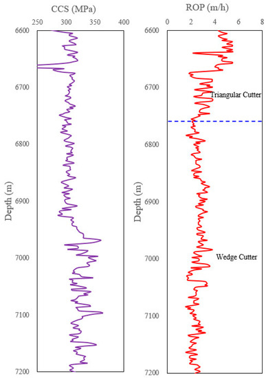 The ROPs of the two drills were compared (as shown in Figure 10). The compressive strength (CCS) of the rock was relatively uniform during the experiment. At 6600–6780 m, the triangular cutter bit was used for rock breaking; below 6780 m, the wedge cutter bit was used for rock breaking. As can be seen from the ROP variation curve, while drilling, the rock breaking efficiency of the triangular cutter was obviously better than that of the wedge cutter. However, from the well exit of the drill bit, the wear of the triangular cutter was more serious, indicating that the Fc required for rock breaking was relatively large. It was easy to wear and tear, which verified the accuracy of the numerical simulation study.