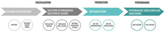 The design and research effort resulted in the development of a “short list” of thermal insulation systems for vertical closures, to be applied to 90% of the existing national building stock, for a significant reduction in production, design and installation costs. The methodology was developed by CITERA, the research centre of Sapienza University of Rome, as part of the “Research of the Electricity System” programme with ENEA and the Ministry of Economic Development concerning “Improving the energy efficiency of production processes and management of the built environment”. This paper is based on three key methodological items—digitalisation, production and performance—whose objective is to identify and promote efficiency solutions aimed at directing the building market demand towards the deep renovation of existing residential buildings to achieve the objectives of energy efficiency, sustainability and cost-effectiveness with guaranteed results and quality control. The proposed methodological approach was tested on a representative case study of the Italian building stock.