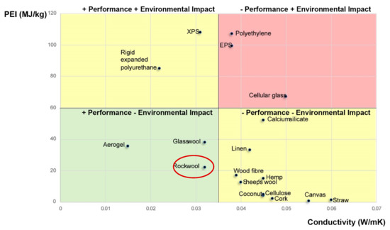 Among insulating systems, those that can be applied from the outside of the building envelope make it possible to completely eliminate thermal bridges that occur due to geometric or material discontinuities. From the quadrant graph (Figure 6) comparing the environmental impact through PEI (on the y-axis) and performance expressed through the thermal conductivity value (on the x axis), among the selected five insulating materials, (excluding aerogel used for insulating the wall from the inside), rock wool is the material with the best performance/environmental impact balance.