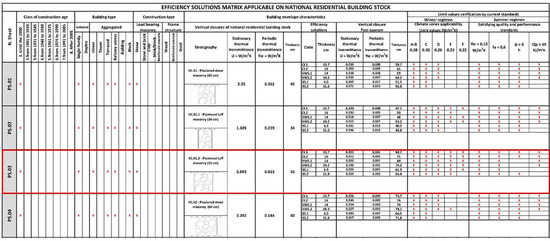 Therefore, the matrix constitutes a useful tool to identify the most suitable upgrading solution for a specific type of opaque vertical closure. The rows that make up the matrix represent the possible types of opaque vertical closures broken down according to the construction period, the building type and the most common construction type. For each opaque vertical closure type, the verification of the minimum requirements according to the regulations in force and therefore, of the applicability of the efficiency solution in the different climatic zones, is reported. In addition, the characteristics of each efficiency solution, applied on each of the existing opaque vertical closures, can be found in the performance data sheets.