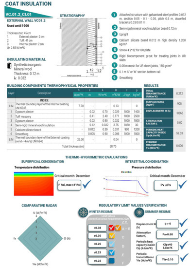 Due to its special structure, rock wool is water-repellent and therefore, maintains its properties over time and does not promote the formation of mould, fungi or bacteria; it is fire retardant and an excellent sound-absorbing material. From the matrix of the national building stock, the energy improvement solution CI.01 was identified for VC.01.2 (Figure 7). This thermal insulating solution was simulated using certified software in a BIM environment and through in situ performance monitoring. Each row of the matrix corresponds to a specific performance sheet of the results achievable from the application of an insulating solution to the existing perimeter wall (Figure 8). The whole matrix is attached in the Supplementary Materials.