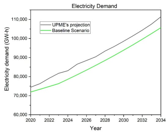 Figure 1 shows the prospective electricity demand curve by the UPME and the prospective electricity demand curve in this study, which considers the expected impact of the pandemic on the growth of electricity demand []. Two percent was considered as the energy demand growth for the period 2020–2023 (Schwenke et al. 2013) and three percent for the period 2024–2035. UPME forecasted an electricity demand growth of more than 2.1% in all periods. In 2034, according to the UPME, the electric energy demand will be 111,399 GWh, and in this study, the electric energy forecast demand in 2034 will be 105,655.2 GWh, i.e., 5.1% lower than the electric energy forecast demand by the UPME. This is due to several factors: (i) this study’s forecast is based on the electricity demand for 2020, which is 3% lower than the forecast made by UPME; and (ii) the prospective demand growth is 2% for the period 2020–2023 and the average growth of the prospective electricity demand by UPME for that period is an average of 3.1%.