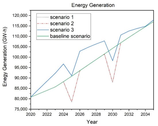 In the baseline scenario, for 2035, a capacity inclusion was assumed to have a matrix of electrical energy capacity composed as follows: non-conventional renewable energies—27.5%, solar energy—11.4%, wind—11.4%, PCH—4%, and co-generators—0.7%, and a share of hydroelectric plants of 46.5%. Currently, the level of participation of renewable solar photovoltaic and wind energy is less than 1%, in this scenario, it is considered that a trend increase in renewable energies will occur. Therefore, the increase to 15% of solar and wind energy capacity aims to reflect some growing trend of integration, such as the one presented by the UPME in scenario 1 of the Generation and Transmission Expansion Plan 2020–2034 []. Scenario 1 of the Generation and Transmission Plan proposes that the increase in solar and wind energy capacity of 15% will be achieved by 2023 and that in this scenario this participation will occur in 2028 because the scenario of this research implies a more conservative inclusion of solar and wind renewable energies.