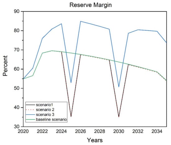 Previously, the effect of the two El Niño events that were simulated on the national power generation system was analyzed, and now the impact on the SIN reserve margin will be studied. Figure 5 shows the SIN reserve margin in the period from 2020 to 2035. In 2020, the system’s reserve margin was 58.2%, which allowed the national electricity system to provide a timely response in the seasons in which the hydroelectric system would present a deficit. In the year 2025, there is a decrease in the reserve margin due to the occurrence of the El Niño phenomenon, which is greater than that presented by the SIN in the periods 1998 and 2010. In 2025, the reserve margin will be 35.1%, therefore, it is considered necessary to increase the reserve margin in this period so that the system is not at high risk of shortage.