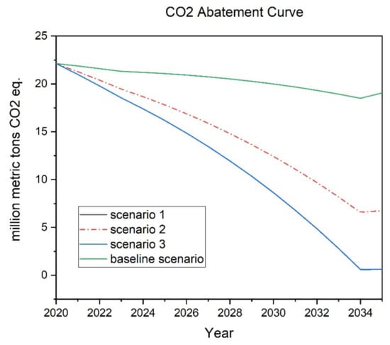 Following the analyses carried out previously, an analysis of GHG reduction in scenario 1 was performed; the main objective is to examine whether the country would achieve compliance with the Paris Agreement through this scenario. Colombia committed to reduce GHG emissions by 20% by 2030 compared to 2010 and to increase its GHG emissions reduction to 30% if it receives international support []. Specifically, the Ministry of Mines and Energy refers that in 2010 emissions from the mining and energy sector corresponded to approximately 29.4 million tons of CO2 equivalent []. The GHG reduction goal for the electric power generation subsector is 4.74 million tons of CO2 equivalent by 2030 []. Figure 5 presents the CO2 abatement curve, which shows the reduction in tons of CO2 equivalent emitted to the atmosphere in the period 2020–2034.