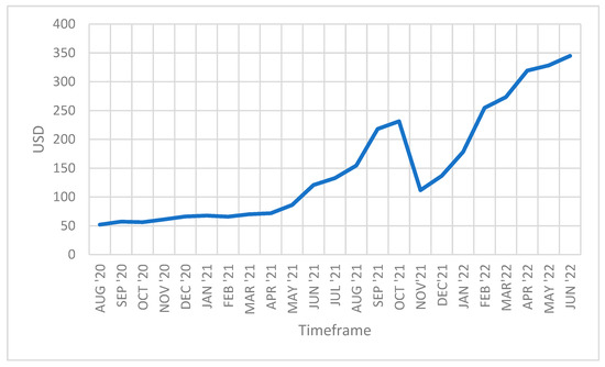 Timeframe for coal price—(API2) CIF ARA (ARGUS-McCloskey) Futures (MTFc1)—monthly averages. Source: author’s own compilation based on collective monthly information from https://pl.investing.com/commodities/coal-(api2)-cif-ara-futures-historical-data (accessed on 20 June 2022).