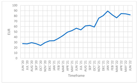 Timeframe for prices of EU Carbon Permits. Source: author’s own compilation based on collective monthly information from https://pl.investing.com/commodities/carbon-emissions-historical-data (accessed on 20 June 2022).