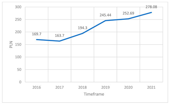 Annual increase of the selling price of electricity (PLN/MWh). Source: author’s own compilation based on collective annual information from the President of the Energy Regulatory Office on the selling price of electricity on the competitive market.