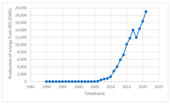 Domestic production of electricity from renewable sources between 1990 and 2021. Source: author’s own compilation based on collective information from the 2021 Polish Power System Report https://www.pse.pl/dane-systemowe/funkcjonowanie-kse/raporty-roczne-z-funkcjonowania-kse-za-rok/raporty-za-rok-2021#r6_3 (accessed on 20 June 2022).