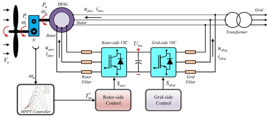 The system configuration of a grid-connected DFIG-based WECS is shown in Figure 1. This configuration is designed to deliver the power of 2 MW. The system comprises a wind turbine, DFIG, rotor-side filter, grid side filter, MPPT controller, DC-link capacitor, and back-to-back three-phase pulse width modulated (PWM) VSCs with their controller. The VSC connected to the rotor winding through the rotor filter is named RSC. The stator winding is directly connected to the grid, and the VSC is connected at the point of coupling (PoC) in GSC []. The RSC and GSC are responsible for achieving the different operating conditions of DFIG. The block scheme of the proposed system is shown in Figure 2.