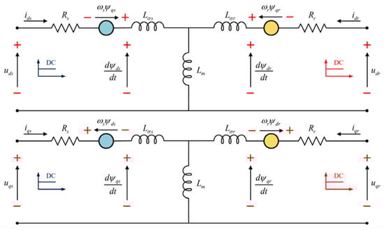 where , , , and : stator and rotor voltages in the dq frame, respectively. , , , and : stator and rotor current in the dq frame, respectively., , and : stator and rotor phase resistances and angular velocity, respectively. From Equations (9) and (10), dq equivalent electric circuit is represented by Figure 3.
