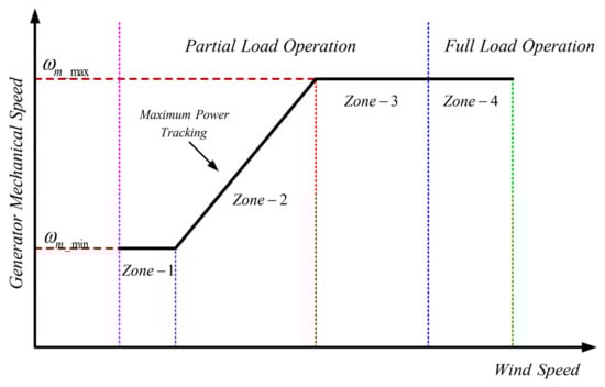 WT consist of four control regions, the wind turbine speed as a function of wind speed is shown in Figure 4. These operating zones can be expresses as follows: