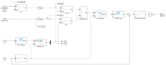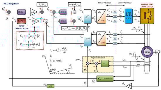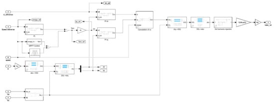 Equation (22) reveal that the is proportional to the , so torque can be controlled with . Expression in Equation (23) reveals that the Qs is controlled using the . The RSC control strategy block diagram is presented in Figure 8, which reveals all control loops and MPPT.