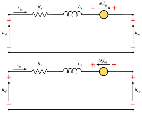 Figure 10 presents the dq model of the grid side system in a stationary frame. Figure 11 shows the direct component of voltage vector oriented along the , considering Equation (24). The dq component of the filter voltage can be expressed by Equation (25) and the expression of the grid exchange active and reactive power in Equation (26).
